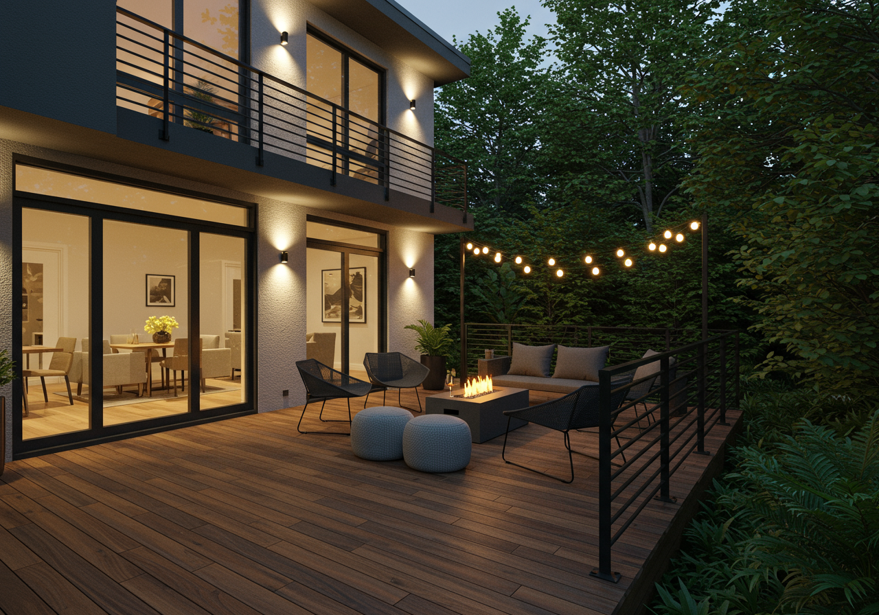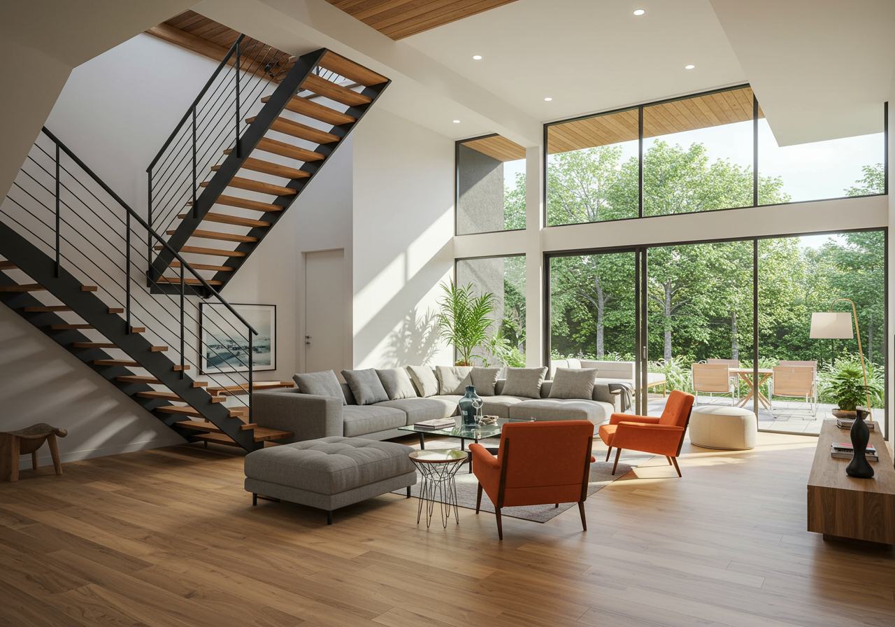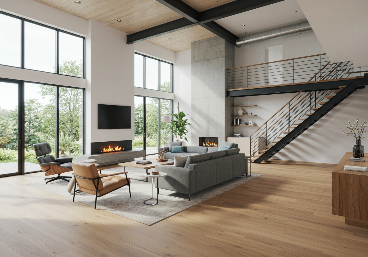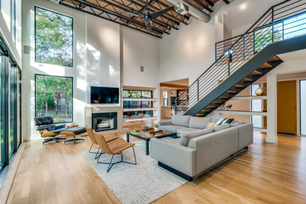 Anchored by a sophisticated hearth and bordered by a sleek staircase, this room is eye-popping in all directions.