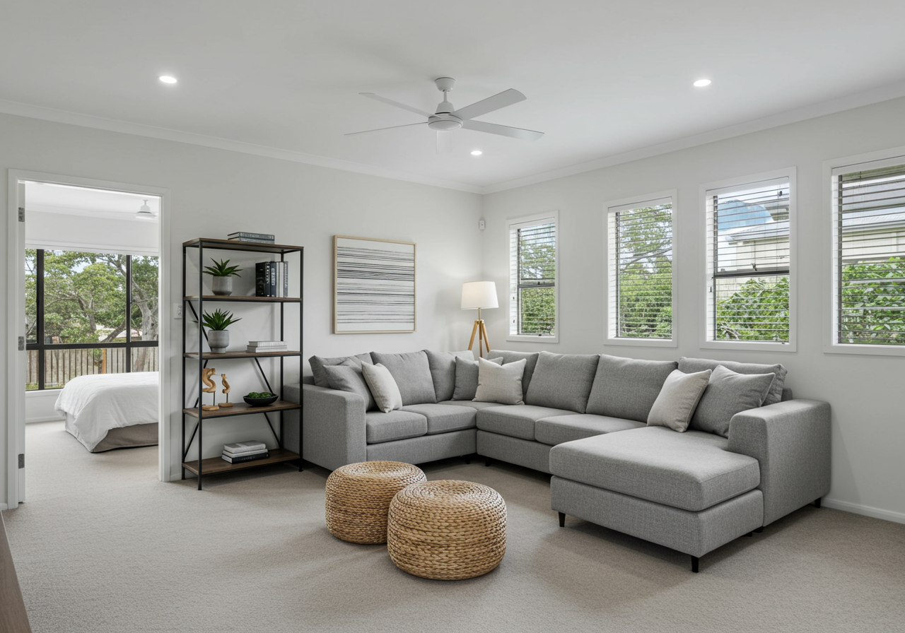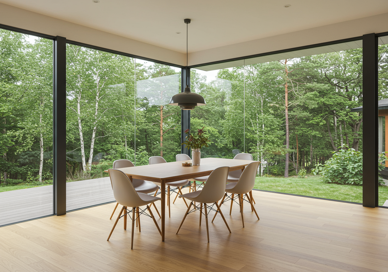 The main living room provides panoramic views through vast panes of pristine glass. The home is surrounded by foliage, which invites natural elements to tastefully contrast the ultra-modern interior.