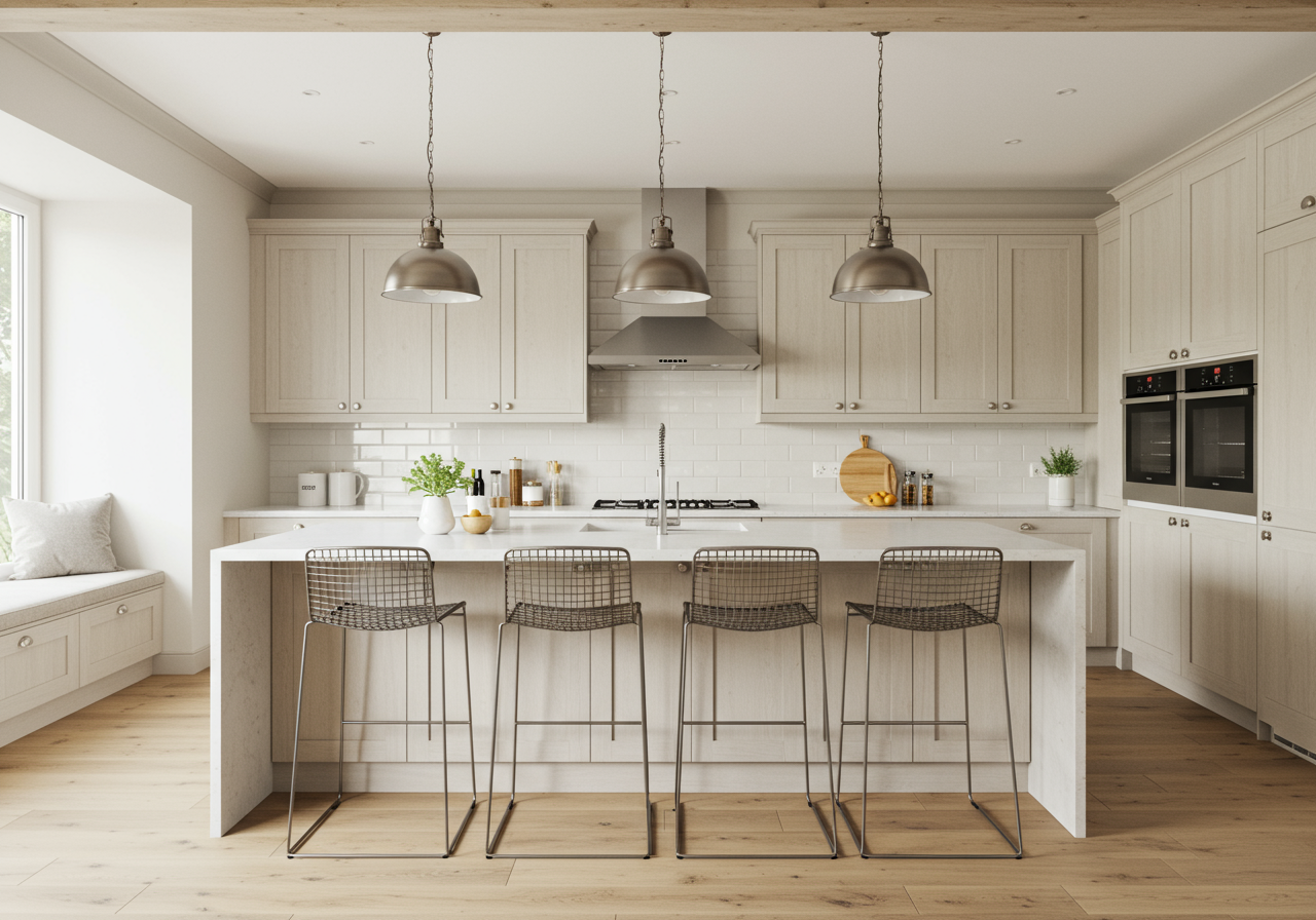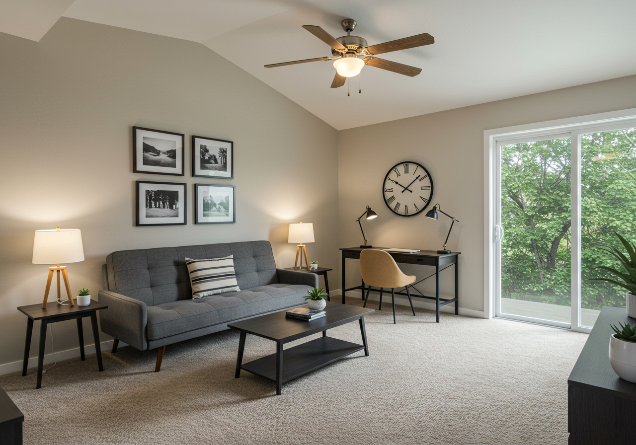 The kitchen creates a scene straight from a modern culinary magazine. With stainless steel appliances, a gas range, and ample counter space, this setup is suitable for even the most discerning home chefs.